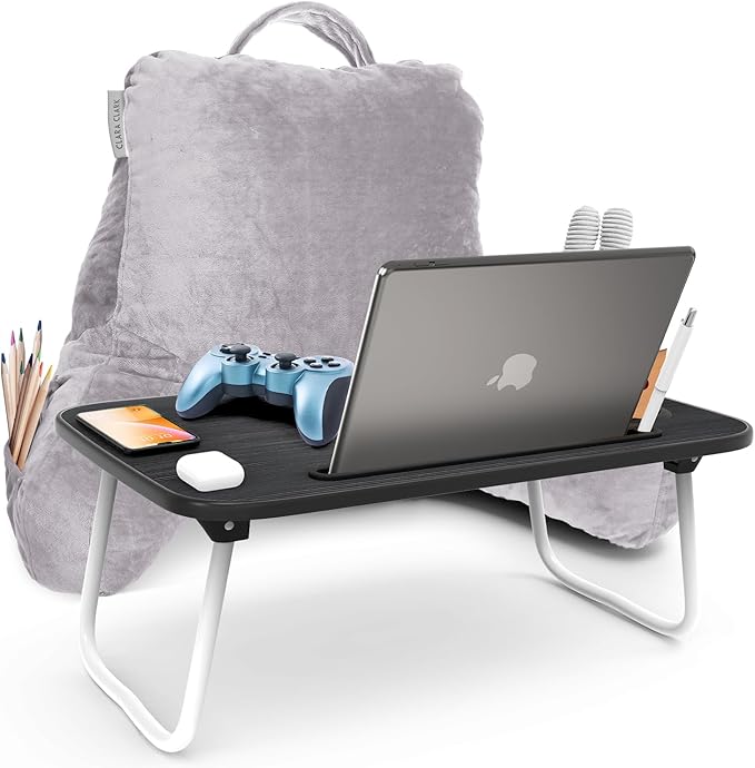Clara Clark Reading Pillow with Portable Lap Desk Set for Kids, Back Pillow for Sitting Up in Bed, Memory Foam Back Support Pillow, Bed Rest Pillow with Foldable Laptop Desk, Small - Grey Lavender