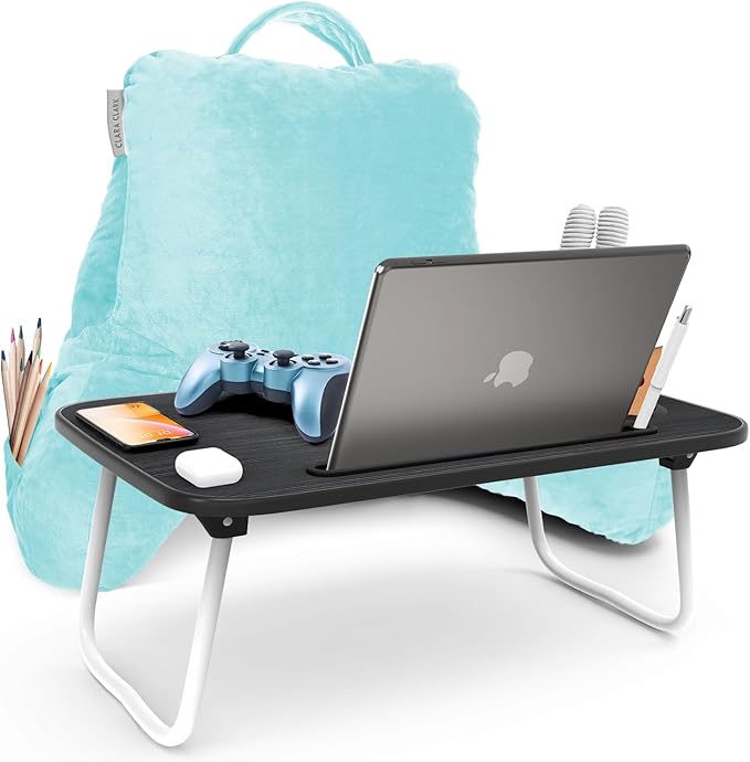 Clara Clark Reading Pillow with Portable Lap Desk Set for Kids, Back Pillow for Sitting Up in Bed, Memory Foam Back Support Pillow, Bed Rest Pillow with Foldable Laptop Desk, Small - Light Blue