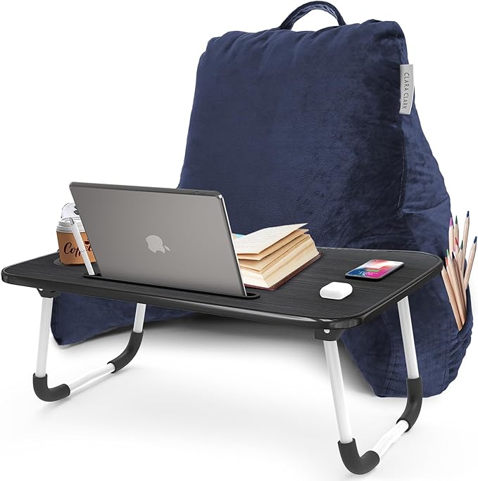 Clara Clark Reading Pillow with Portable Lap Desk for laptop Set, Back Pillow for Sitting Up in Bed, Memory Foam Back Support Pillow, Bed Rest Pillow with Foldable Laptop Desk, Standard - Navy Blue