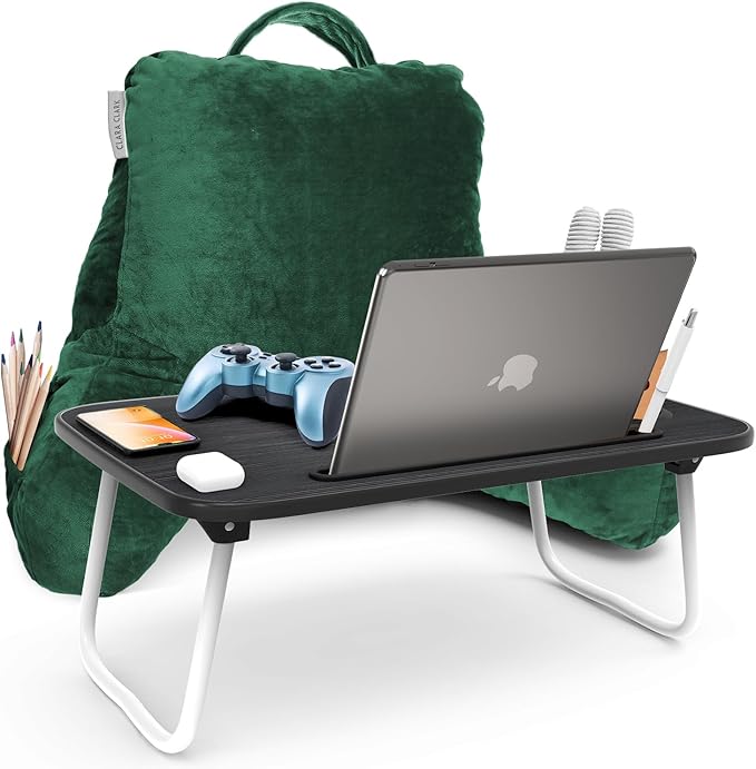 Clara Clark Reading Pillow with Portable Lap Desk Set for Kids, Back Pillow for Sitting Up in Bed, Memory Foam Back Support Pillow, Bed Rest Pillow with Foldable Laptop Desk, Small - Dark Green