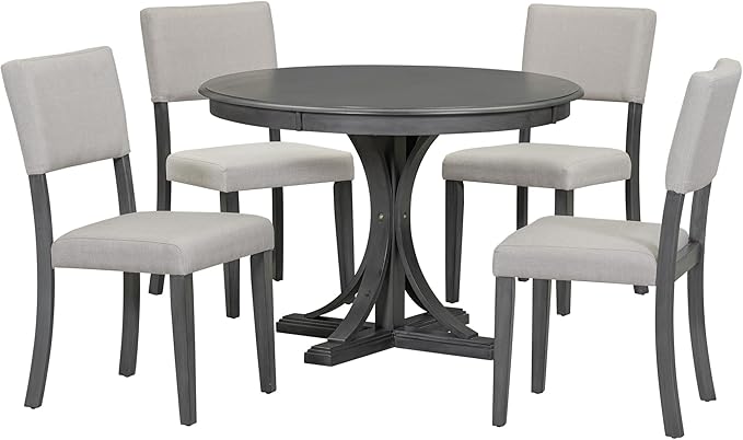 5-Piece Retro Round Dinette Sets Kitchen Dining Table with Curved Trestle Style Legs, 4 Upholstered Chairs, for Diningroom Living Room, Easy to Assemble, Dark Gray
