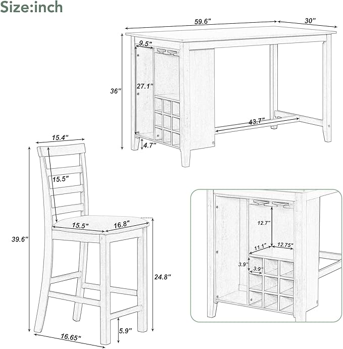 RITSU Modern 5-Piece Dining Set, Multi-Functional Counter Height Dinette Suit with Padded Chairs and Integrated 9 Bar Wine Compartment, Wineglass Holders for Home Kitchen, Gray-1