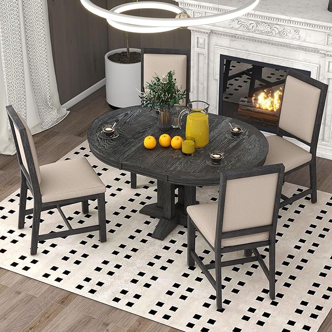 RITSU Farmhouse 5-Piece Dining Set, Included Retro Extendable Round Table with X-Shape Base and 4 Upholstered Chairs, Solid Wood Adjustable Dinette Furniture for Kitchen Living Room, Black, 1
