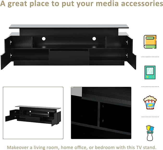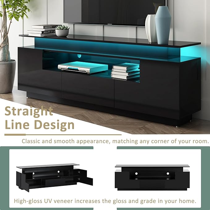 Modern Functional Stand with Color Changing LED Lights and Storage Space, High Gloss Television Cabinet for TVs Up to 75+'' for Living Room Furniture, 75 inch, Black