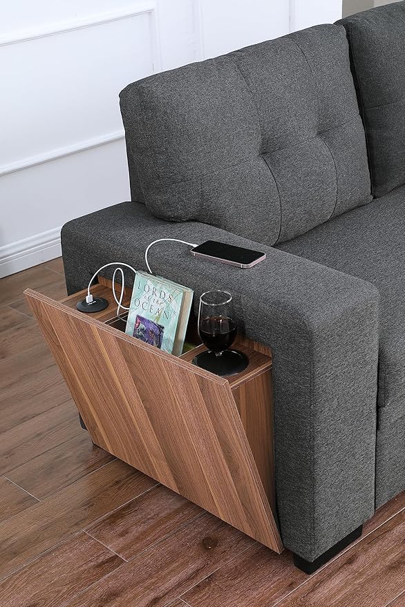 92" L-Shape Sectional Sofa with Storage Chaise Pull-out bed, Linen Tufted Upholstery Corner Couch W/Side Open Cup Holder for Living Room, Apartment,Office,Home Furniture Sets,Dark Gray