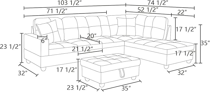 ROOMTEC Button L Shape 3 Piece Sectional Sofa Set, Upholstered Corner Couch with Storage Ottoman, Faux Leather Tufted Cushions, for Living Room, Apartment, 103inch, Deer Brown w/Right Chaise Lounge