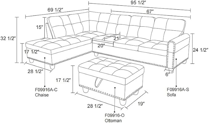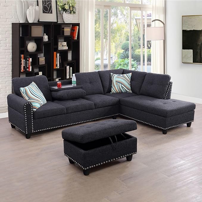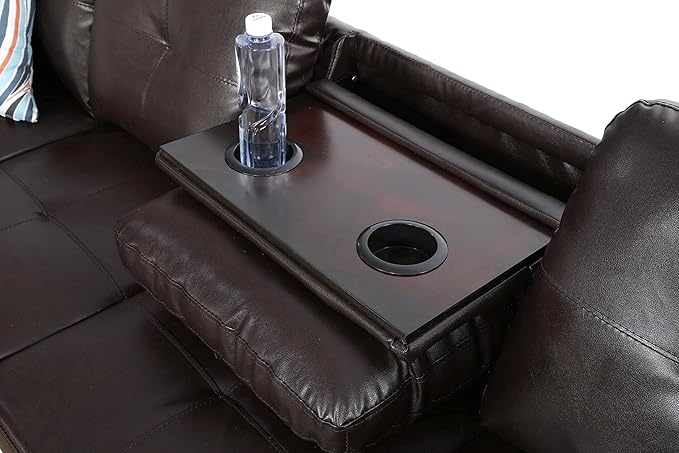 ROOMTEC Modern L Shaped Sectional Sofa with Storage Ottoman, Left Facing Chaise Longue, Reversible Backrest w/ 2 Cup Holders, Faux Leather Tufted Cushions, for Living Room, Apartment, Brown