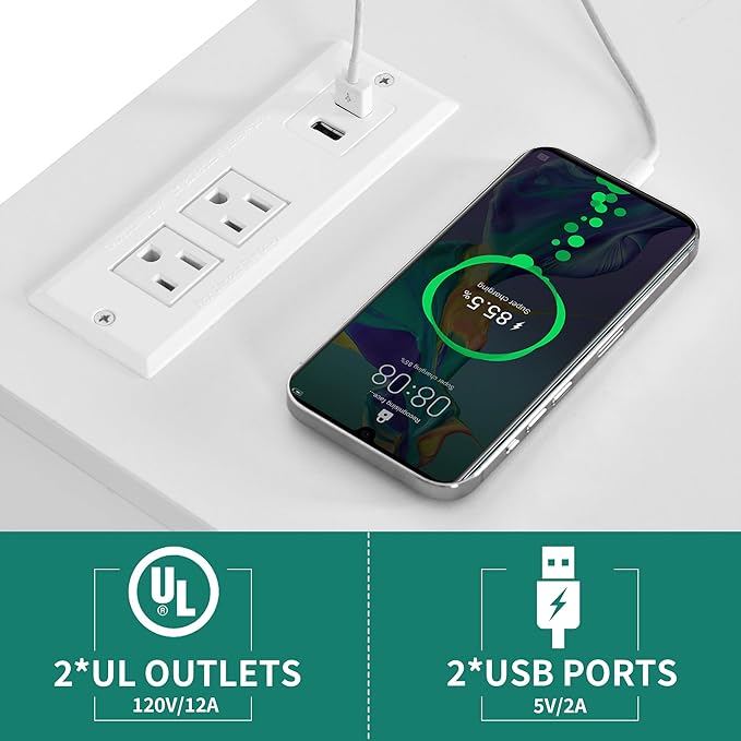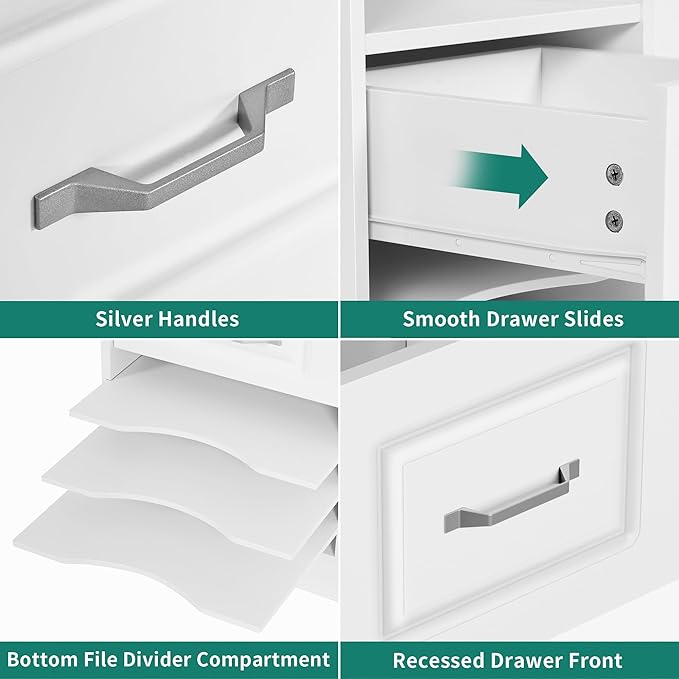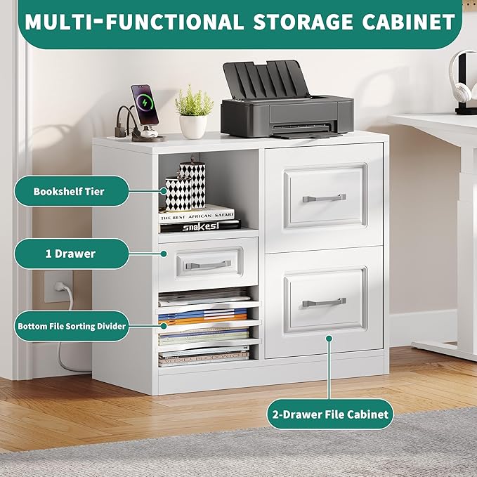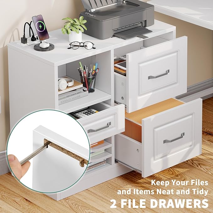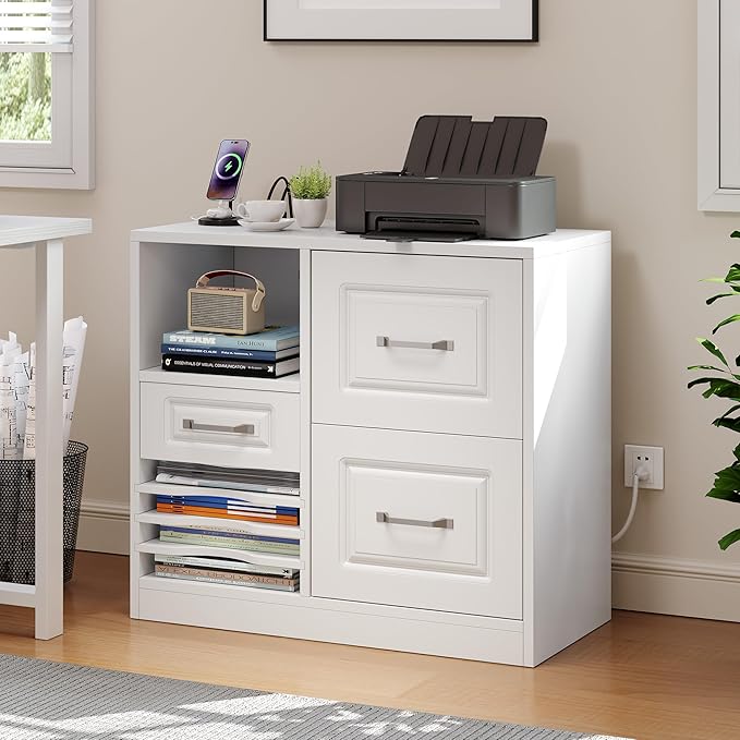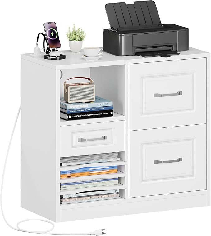 YITAHOME 3 Drawer File Cabinet, Filing Cabinet with Charging Station, Printer Stand with Open Storage Shelves, Fits for A4, Letter, Legal Size Files, White