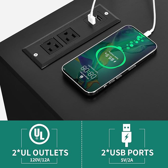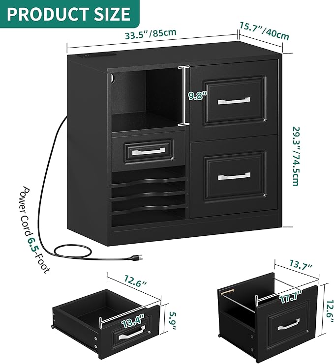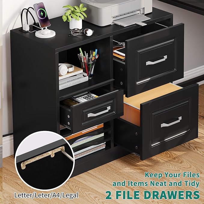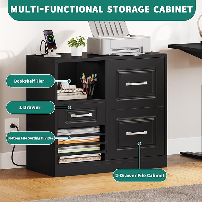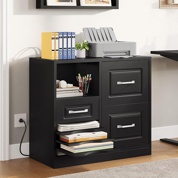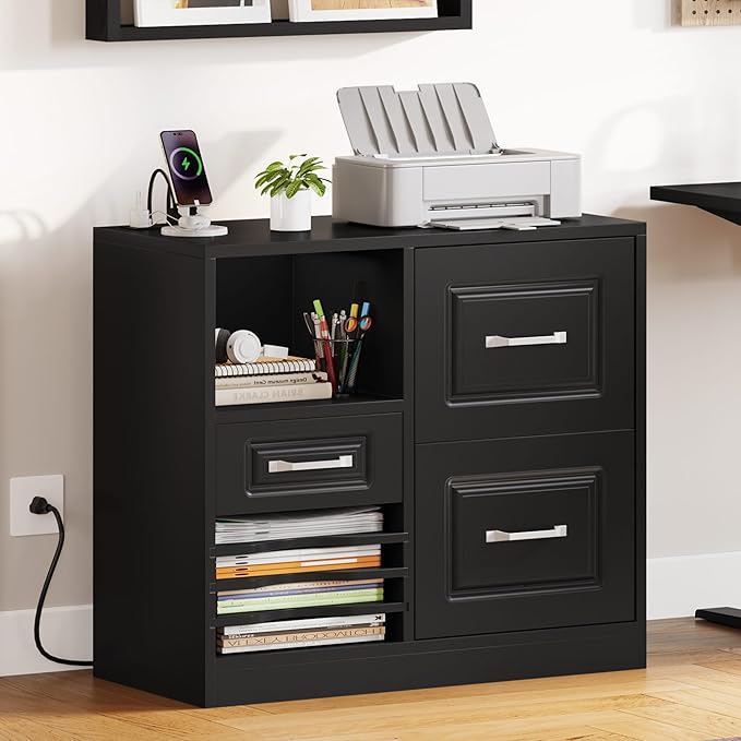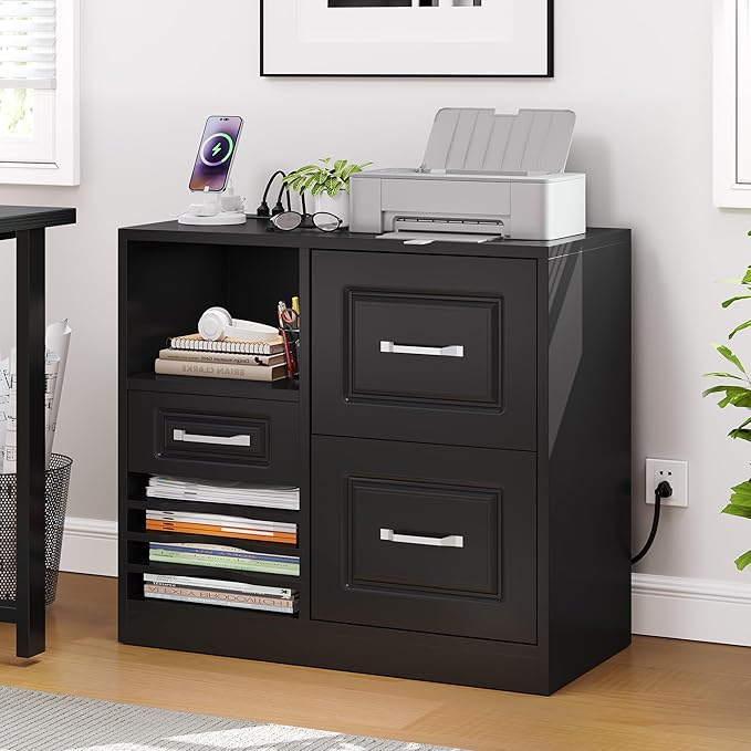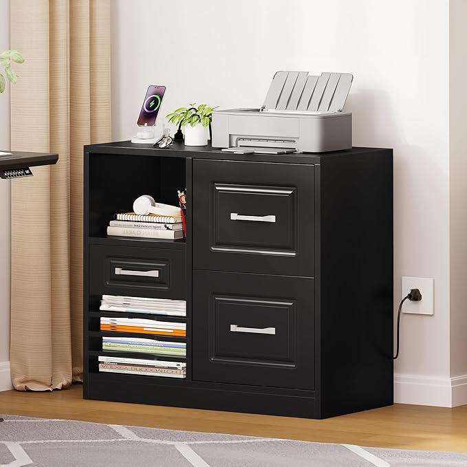 YITAHOME 3 Drawer File Cabinet, Filing Cabinet with Charging Station, Printer Stand with Open Storage Shelves, Fits for A4, Letter, Legal Size Files, Black