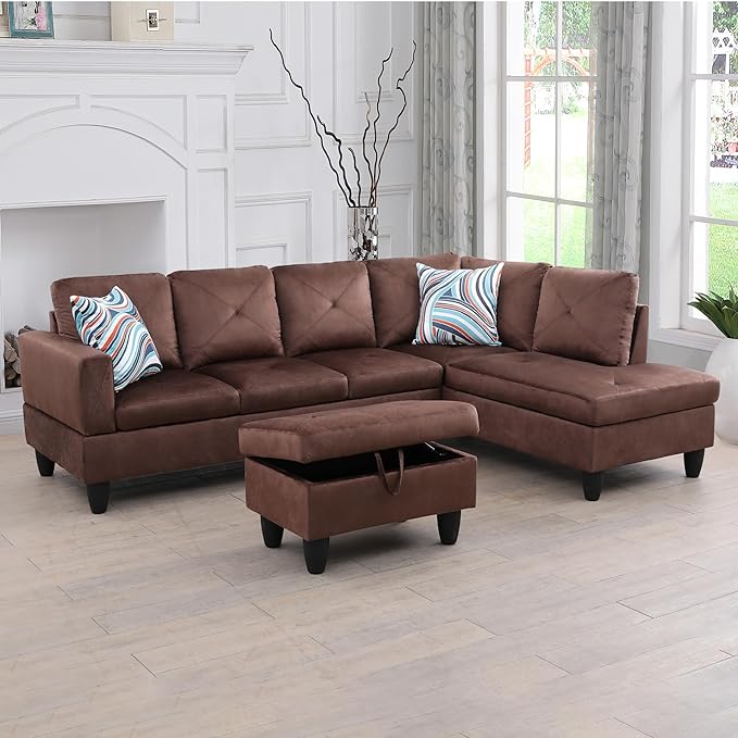 L Shaped Sofa with Ottoman Modern Sectional Living Room, Bedroom, Office, L Couch Brown