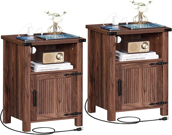Night Stand Set of 2, 18 Inch Farmhouse Nightstand with with Charging Station and USB Port, Rustic Wood Bedside Table with Magnetic Door, Bed Side Tables for Bedroom, Brown Walnut