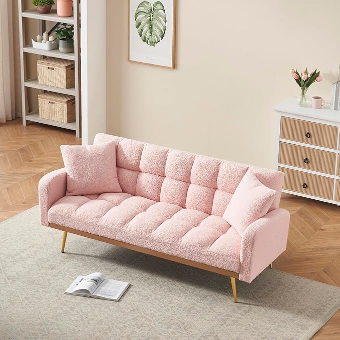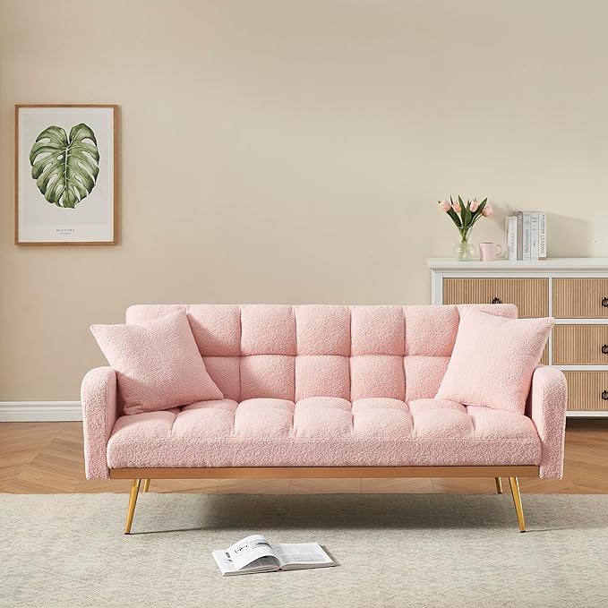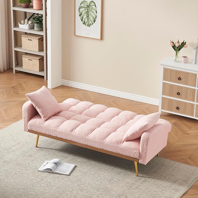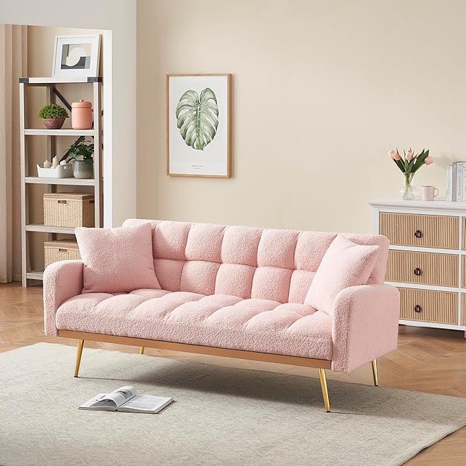 Fabric Teddy Fleece Folding Futon Sofa Bed w/Adjustable Backrests, 2 Seater Tufted Convertible Lounge Couch Recliner Loveseat with Metal Golden Legs for Living Room, Office,Bedroom, Pink 69"