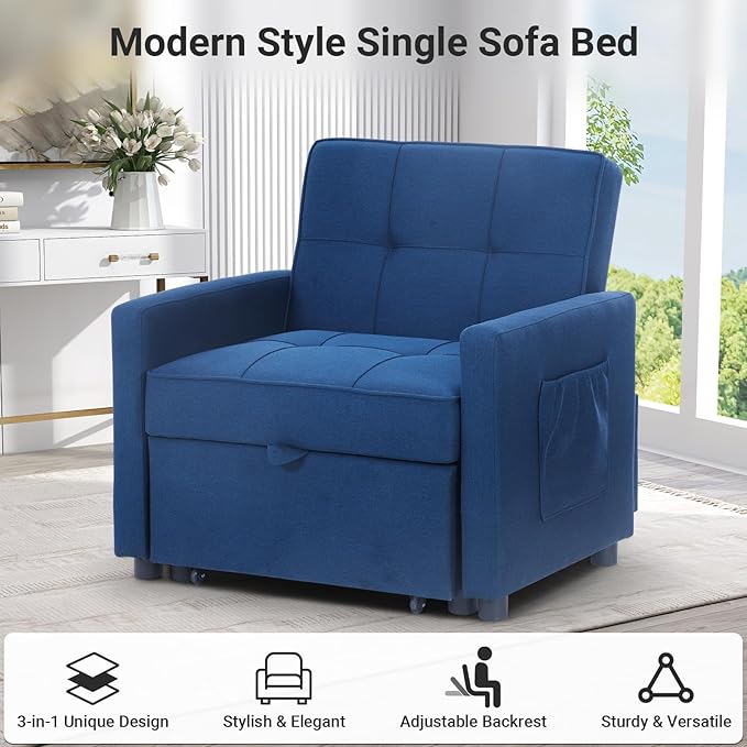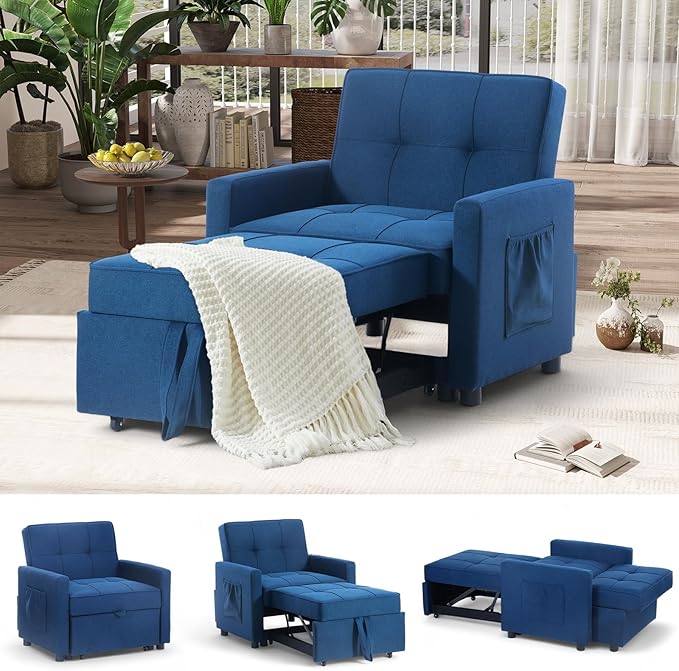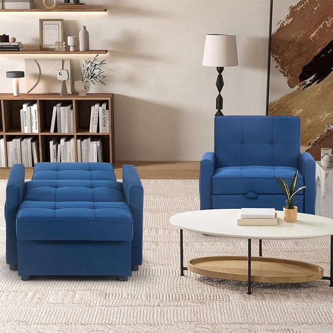4-in-1 Convertible Sleeper Sofa, Single Pull Out Couch Chair with 6-Level Adjust Backrest Loveseat with Storage and Pillows, Modern Recliner for Living Room Apartment Office, Blue