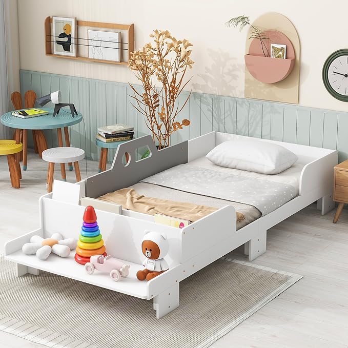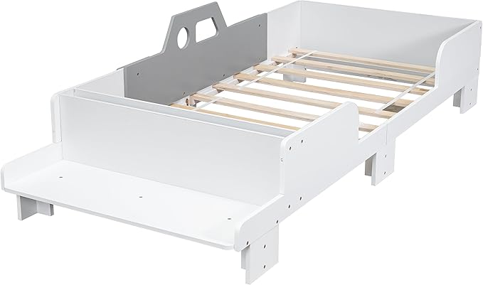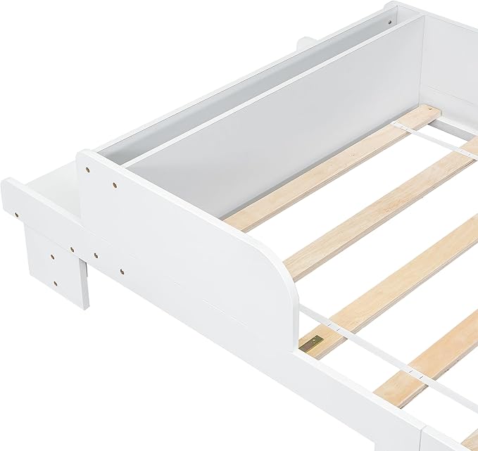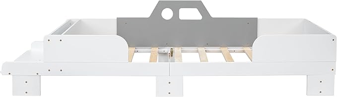Car-Shaped Twin Bed with Bench,Wood Platform Bedframe W/Book Storage Groove & Safety Guardrail,Minimalistic Design,Easy Assembly,Toy Car Bedroom Furniture for Boys Kids Toddlers Child,White
