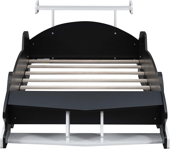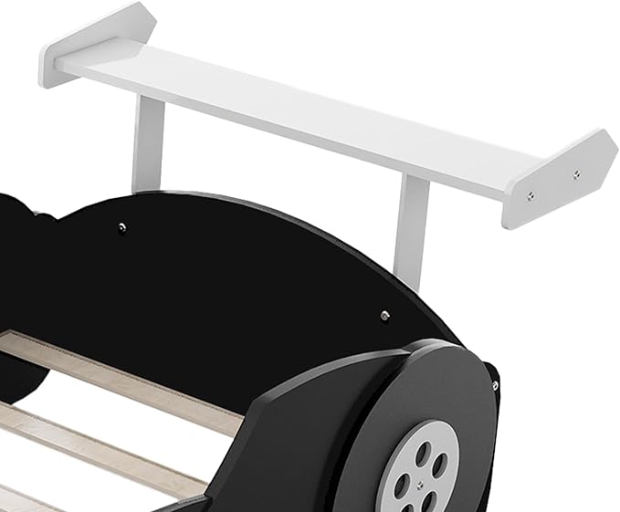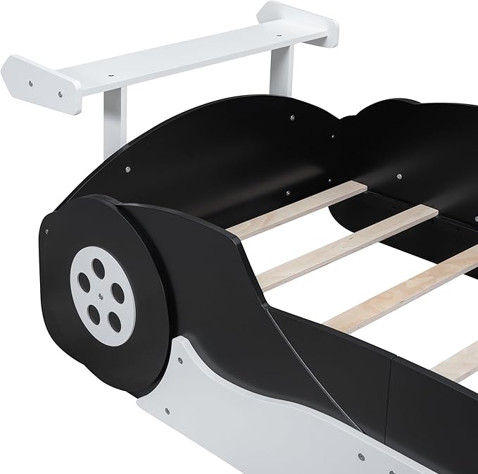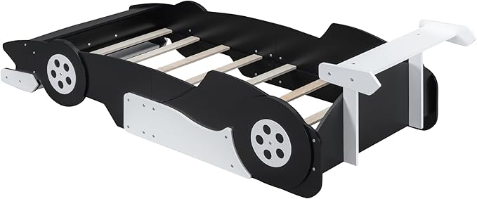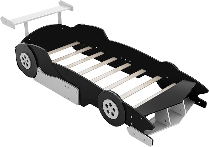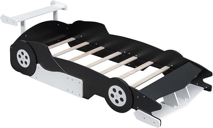 Twin Size Racecar Bed for Big Boys,Wood Platform Bedframe with Wheels & Safety Guardrail,Slats Support,Easy Assembly,Toddlers Kids Car Floor Beds for Fun Children's Bedroom,Black