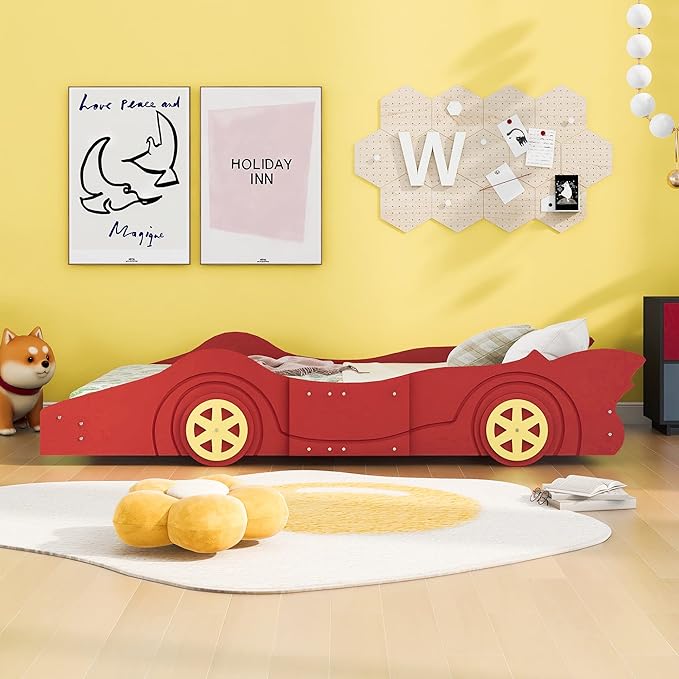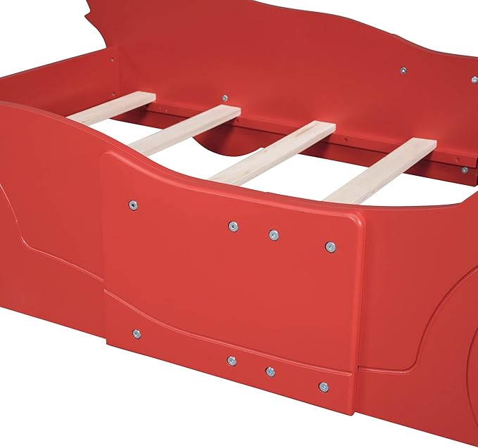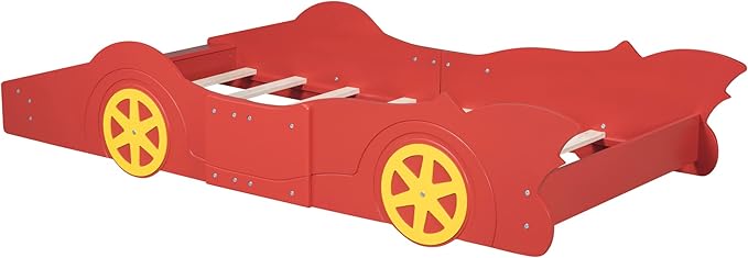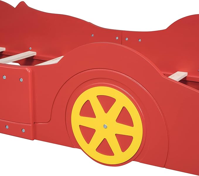 Car Shaped Toddler Bed with Wheels,Racecar Platform Beds W/Safety Guardrail,Slats Support,Stylish Design,Easy Assembly,Wood Twin Bedframe for Boys Toddlers Kids Teens Bedroom,Red