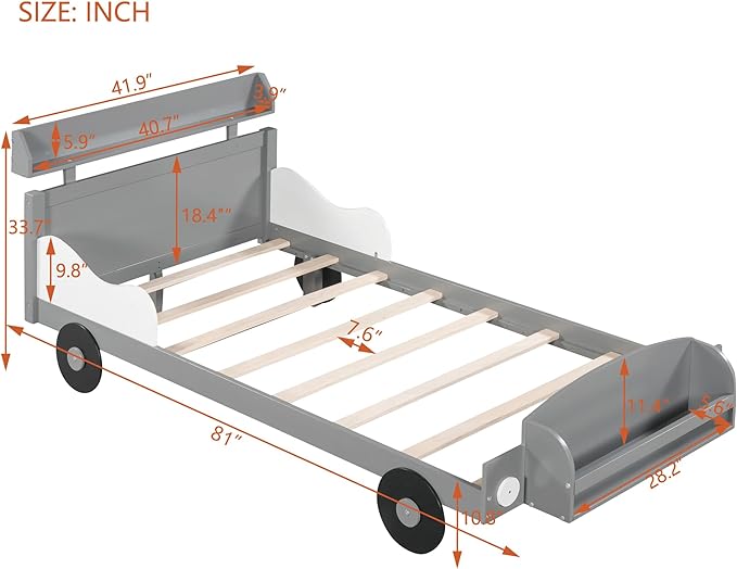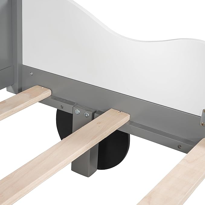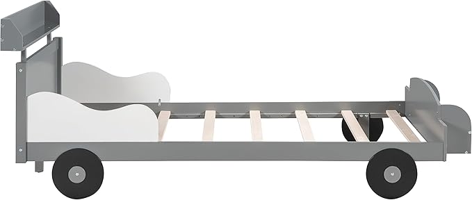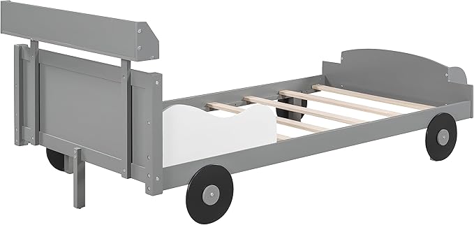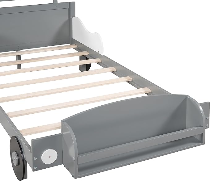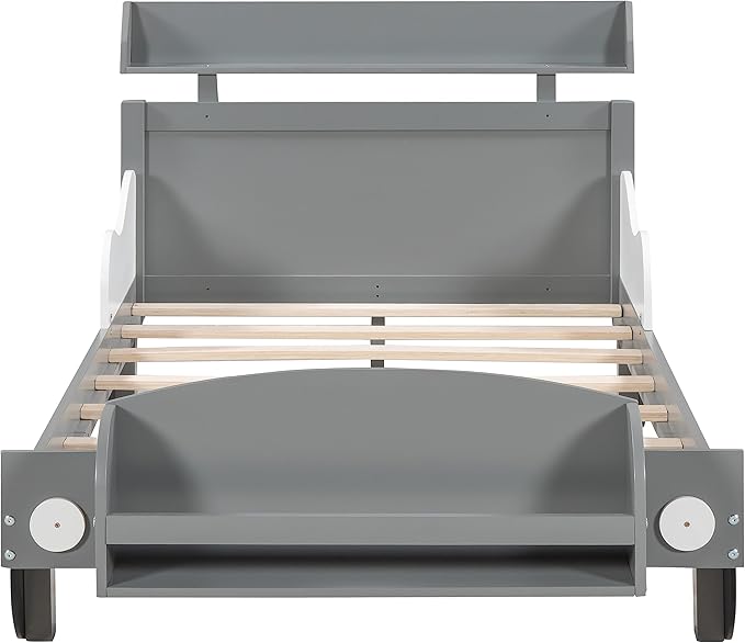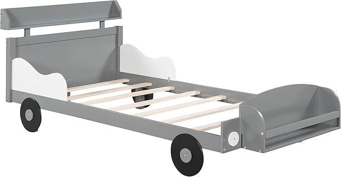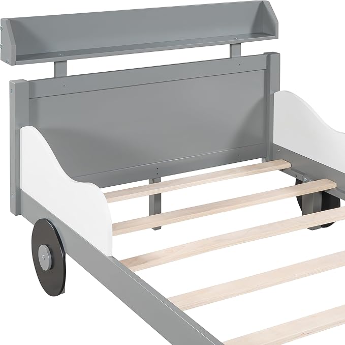 Twin Size Car-Shaped Platform Bed with 2 Storage Shelf,Kids Cars Beds W/Wheels,Slats Support,Saving Space,Easy Assembly,Wood Car Bedframe for Boys Toddlers Teens Bedroom,Gray