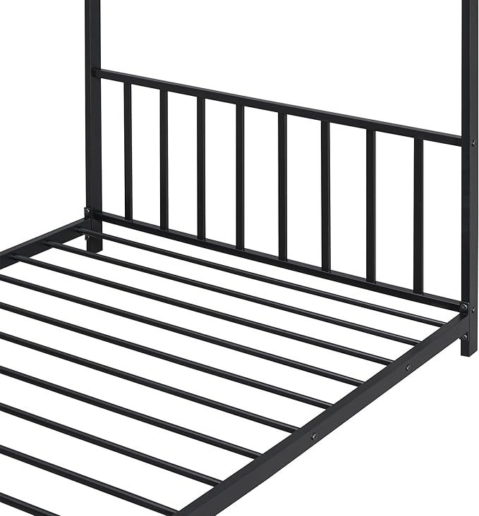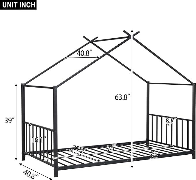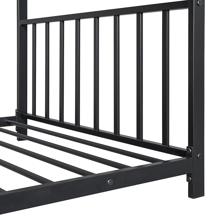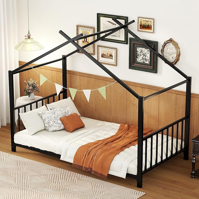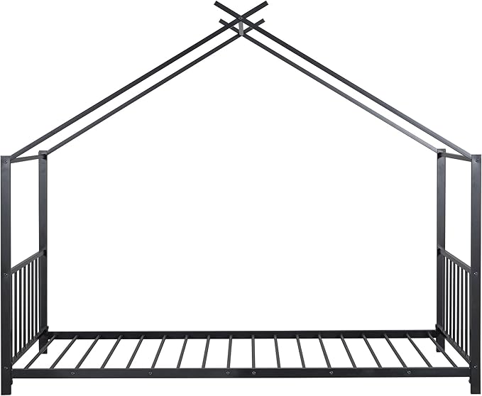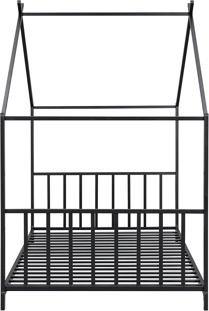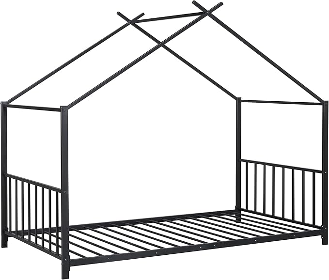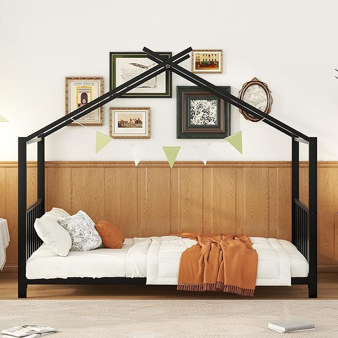 Twin Size Kids Montessori Floor Bed,House Bed Frame with High Headboard,Twin Floor Bed with Roof for Boys Girls,Floor Bed Metal Frame (Black)