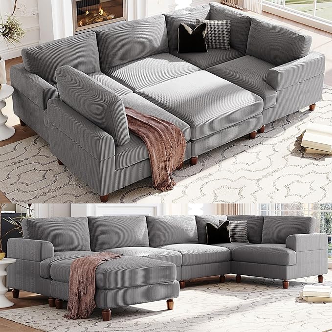Free Combination Oversized Modular Sectional Sofa with Movable Ottomans, L/U Shaped Reversible Corner Couch,6 Seater Corduroy Upholstered Sofa&Couch Convertible Sleeper Sofabed for Living Room