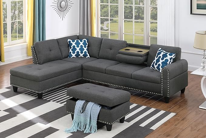 98" L-shaped Sectional Linen Sofa with Storage Ottoman,Upholstered Couch W/Hidden Cup Holder & 2 Toss Pillows,Nailhead Tufted Design,Corner Sleeper for Living Room Apartment Home,Dark Gray