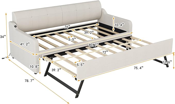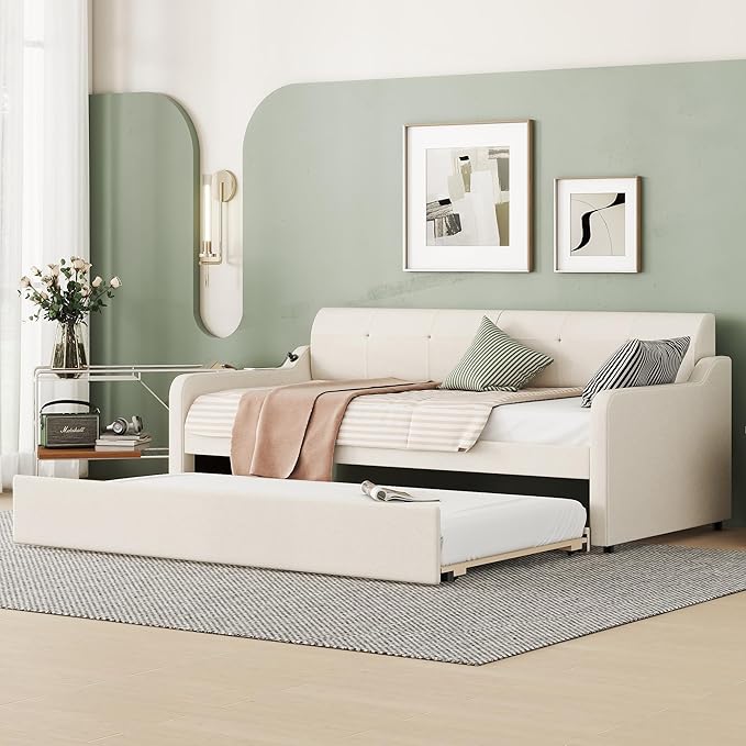 Twin Size Daybed Frame with Pop up Trundle,Upholstered Day Bed with Charging Station,Daybed with Trundle Bed Twin,Wood Sofa Bed Frame with USB for Bedroom,Living Room,Guest,Office,Twin,Beige