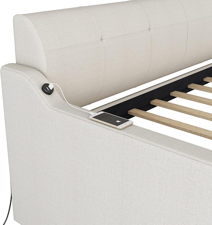 About This Linen đ„ăSpace-saving Upholstered DaybedăUpholstered in linen fabric,features a backrest and two armrests with soft materials,this pop up trundle...