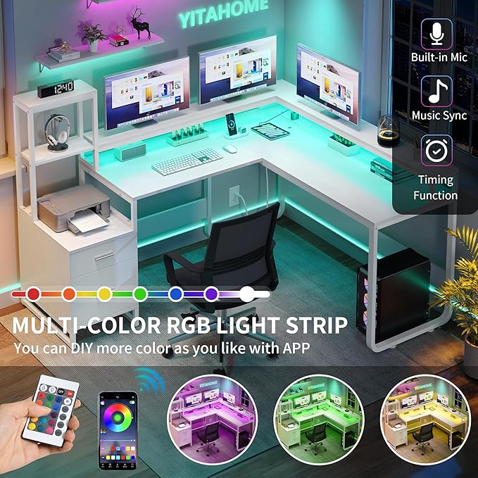 YITAHOME L Shaped Desk with Power Outlets & LED Lights, Reversible Computer Desk with Drawers & Hutch, Corner Desk Office Desk with Monitor Stand, Printer Stand, 2 Person Desk, White