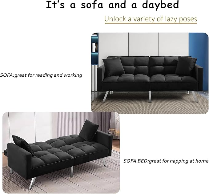 Futon Sofa Bed Living Room Furniture Sets 74" Modern Convertible Folding Lounge Couch Loveseat Daybed Upholstered Sofá with 2 Pillows for Bedroom Apartment,Home Office,Black