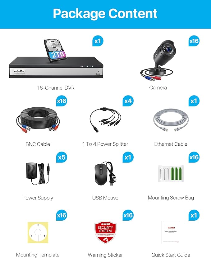 ZOSI 3K Lite 16Channel Security Camera System, AI Human/Vehicle Detection, Night Vision, 16pcs H.265+ 1080P Outdoor Bullet Cameras, 1080P 16CH Surveillance DVR with 2TB HDD for 24/7 Recording