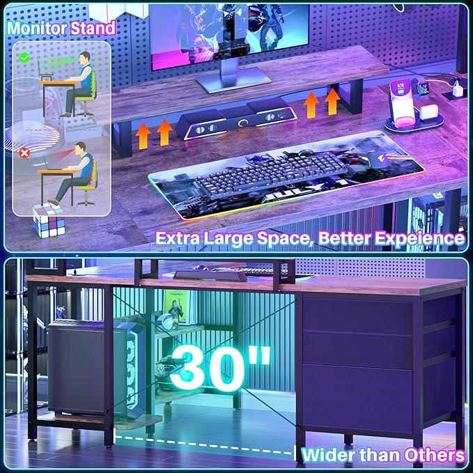 Aheaplus L Shaped Desk with Hutch, Gaming Desk with Led Lights, Reversible Computer Desk with Power Outlet, Corner Desk with File Drawer & Monitor Stand, Storage Shelves for Home, F1, Rustic Brown