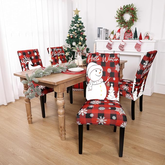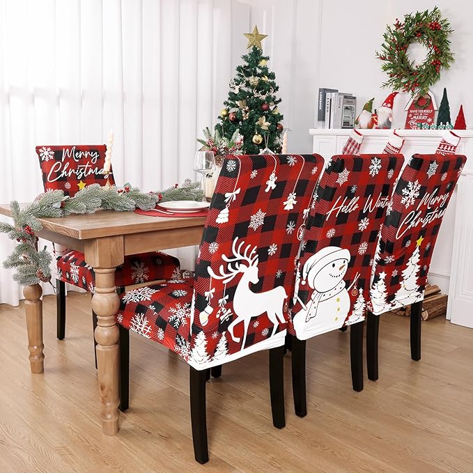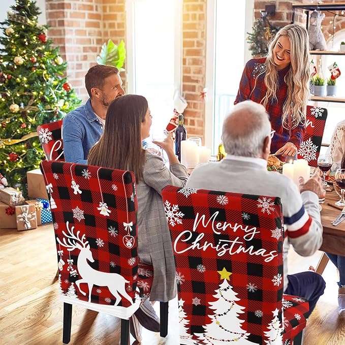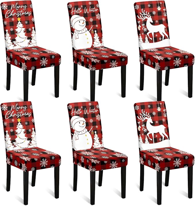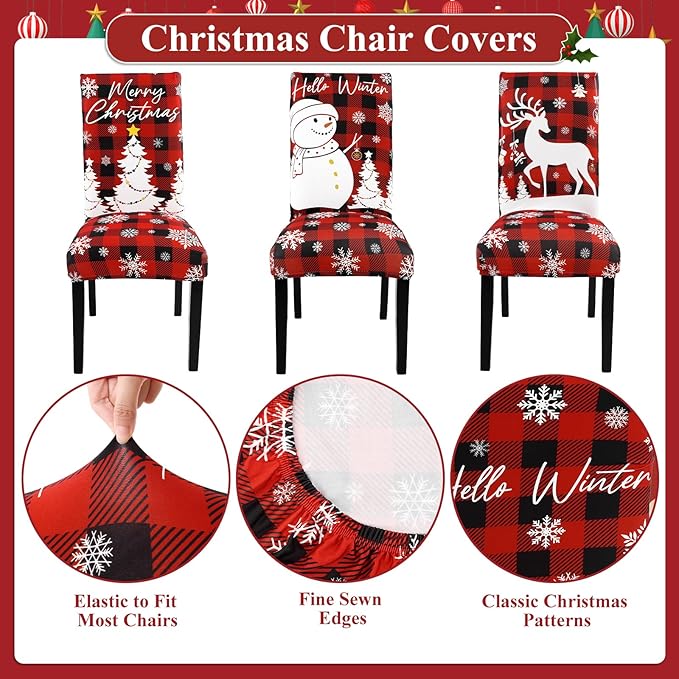 U'Artlines Christmas Chair Covers Set of 6, Removable Washable Merry Christmas Dining Chair Seat Covers Stretch Protector Slipcovers for Dining Room Kitchen Holiday Party Decor, Red Buffalo Plaid