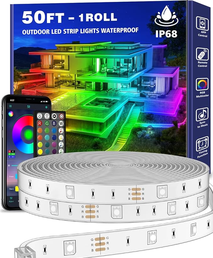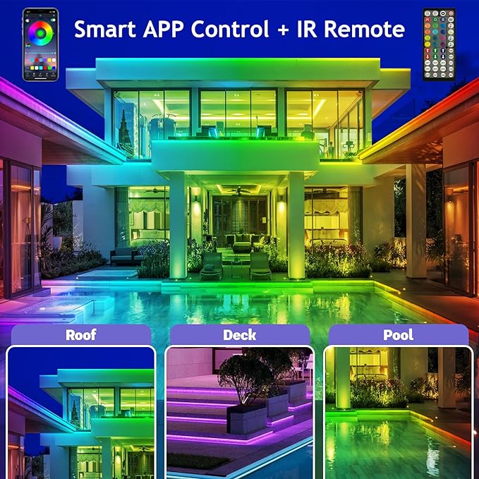 50ft Outdoor LED Strip Lights Waterproof,IP68 Outside Led Light Strips Waterproof with App and Remote,Music Sync RGB Exterior Led Rope Lights with Self Adhesive Back for Deck,Balcony,Pool